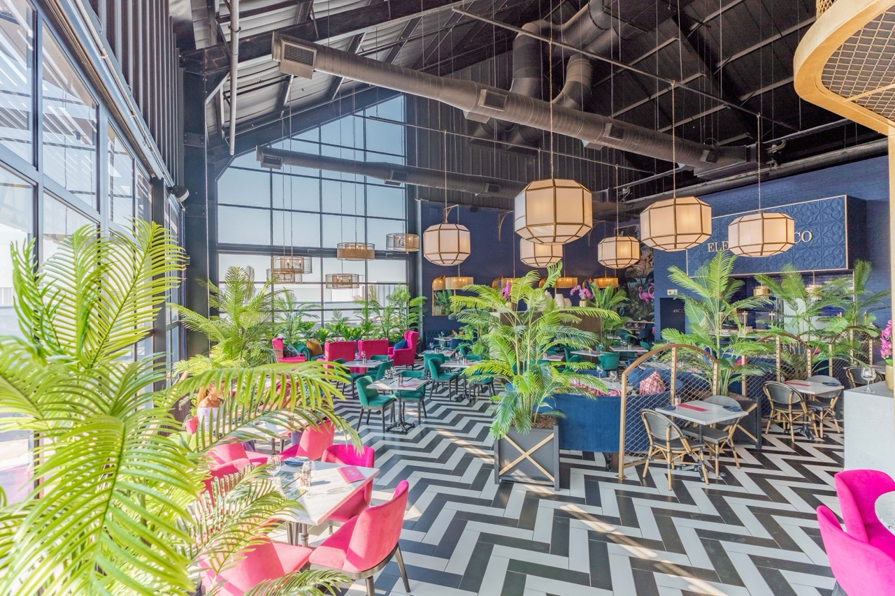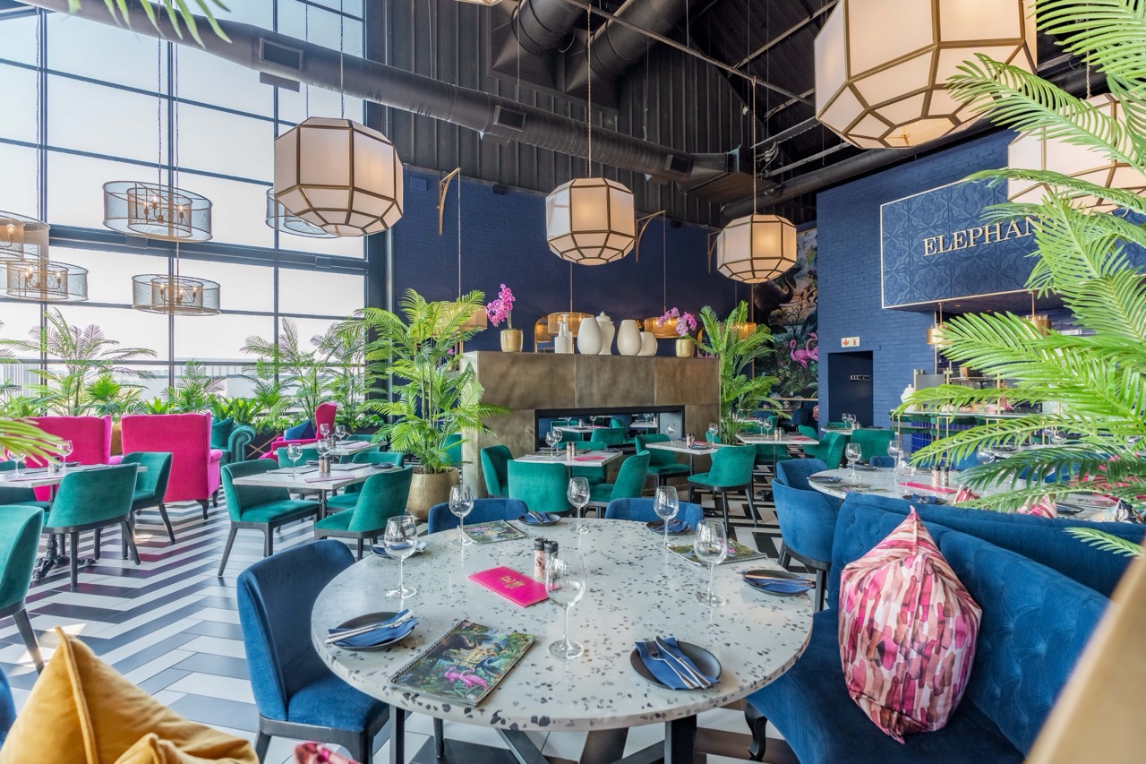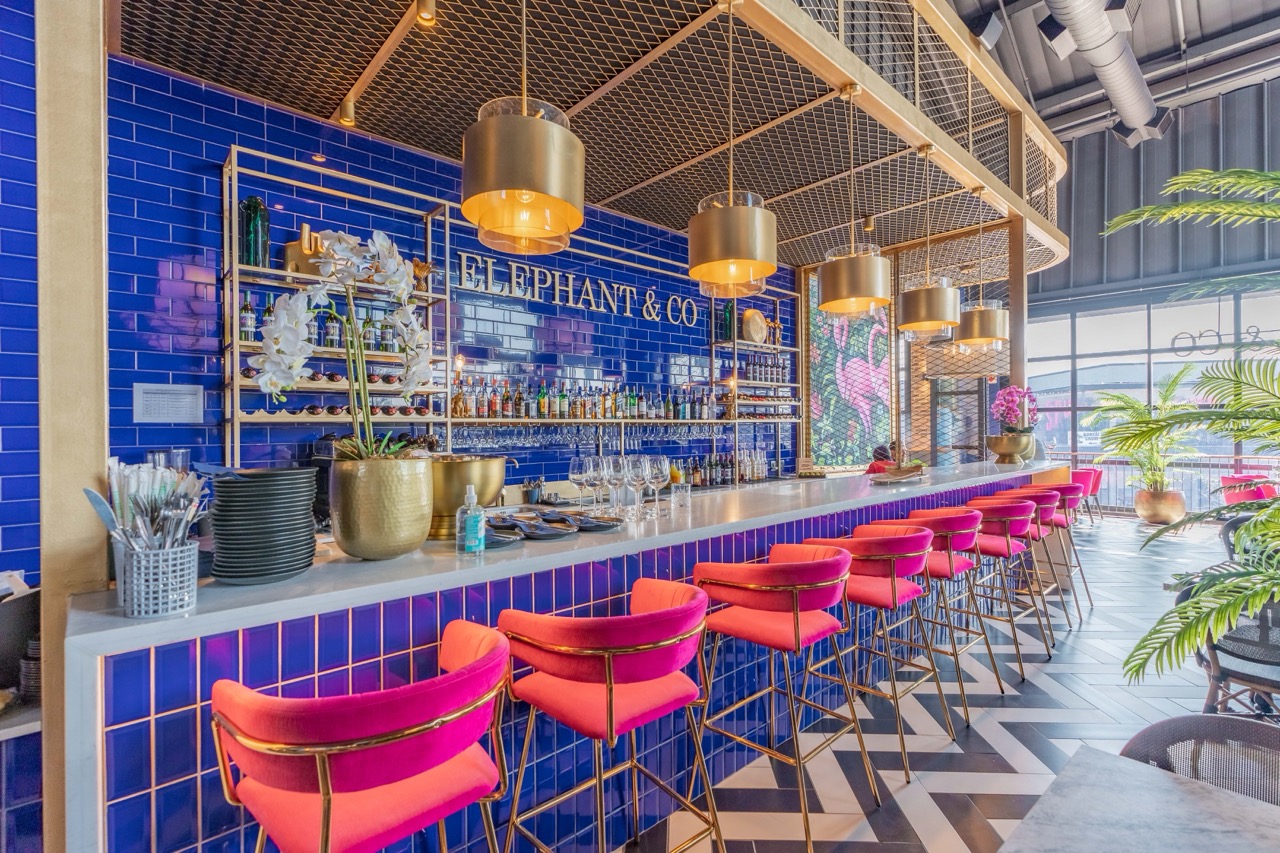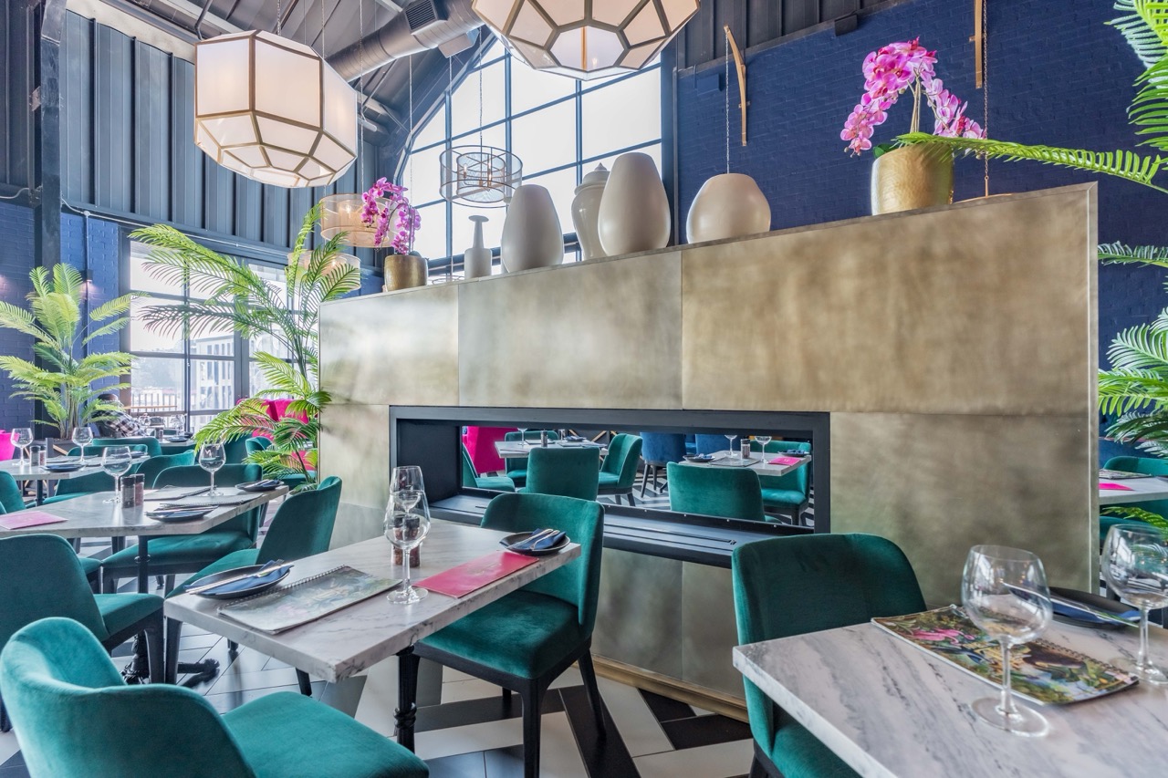 Our goal was to craft a space that mirrors the vibrant energy and bold flavours of African-Asian fusion cuisine. The design is a celebration of colour, culture, and creativity, blending the visual elements of both continents to transport guests into an exotic, sensory journey. The colours are bold, exciting, and vibrant, creating a dynamic atmosphere that stimulates the senses. Rich tones of pink, green, and blue fill the space, each hue carefully chosen to evoke warmth, energy, and excitement. Striking wallpapers featuring elephants, flamingos, monkeys, and other exotic wildlife add a playful, yet sophisticated touch. Tropical greenery and textured design elements enhance the feeling of being in an exotic oasis.